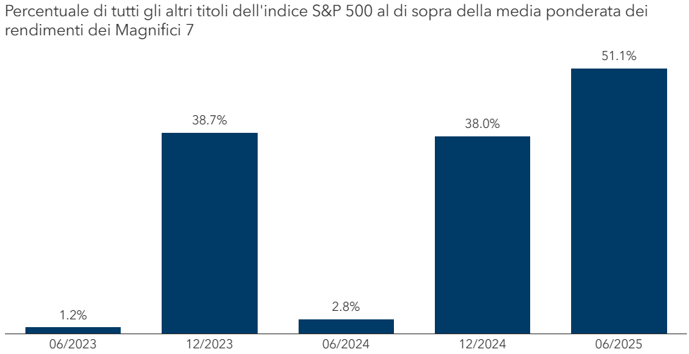 Considerando periodi semestrali continuativi fino al 30 giugno 2025, la percentuale di titoli che hanno conseguito rendimenti superiori alla mediana dei Magnifici 7 ha raggiunto il 51%, ovvero 251 titoli. Si tratta di un aumento rispetto all'1% registrato a giugno 2023, che corrispondeva solo a cinque società.
