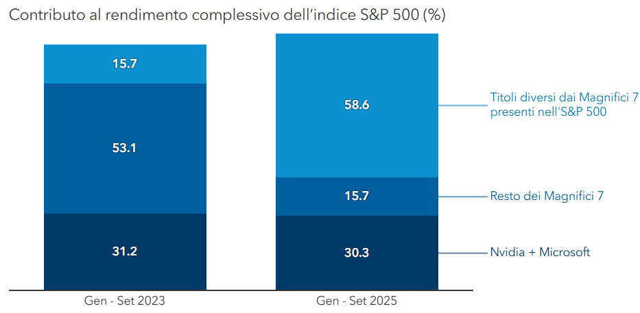 Dopo tre anni in cui i Magnifici 7 sono stati responsabili della maggior parte del rendimento annuo conseguito dall'indice S&P 500, ora sono più numerose le società che vi contribuiscono. Al 30 settembre, i titoli diversi dai Magnifici 7 rappresentavano il 59% del rendimento di quest'anno.