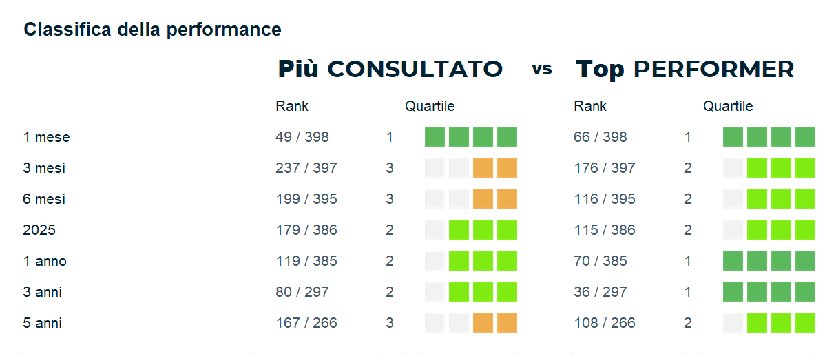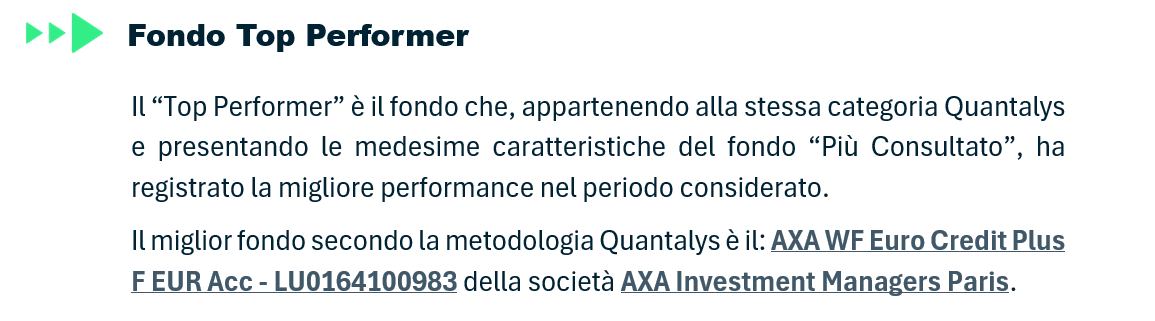 * La metodologia utilizzata per l'elaborazione dei dati è interna a Quantalys. I calcoli sono aggiornati al 31/10/2025. I calcoli sono effettuati da Quantalys e sono basati sui dati inviati giornalmente dalle società di gestione. Eventuali errori o omissioni sono di esclusiva responsabilità di Quantalys. Nonostante la massima cura prestata nella raccolta, nella verifica e nell’elaborazione dei dati provenienti da fonti ritenute affidabili, Quantalys non garantisce che i dati ricevuti siano accurati. Tutti i calcoli sono effettuati in euro.