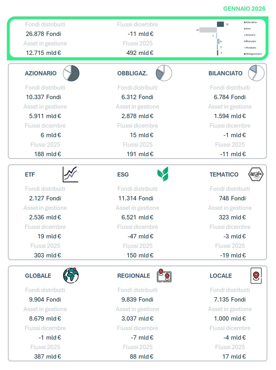 © 2026 Quantalys. Tutti i diritti riservati. Le informazioni fornite sono di proprietà di Quantalys Italia Harvest Group; possono non essere esaustive e non costituiscono raccomandazione o sollecitazione all’investimento. Quantalys Italia Harvest Group non si assume alcuna responsabilità per le eventuali conseguenze derivanti da decisioni assunte o iniziative intraprese sulla base delle informazioni riportate nel presente documento. Tutti i dati sono aggiornati alla data indicata e attribuiti a Quantalys Italia Harvest Group, salvo diversa indicazione.