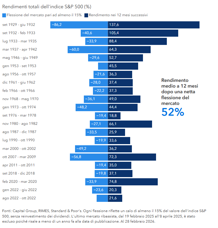 Fonti: Capital Group, RIMES, Standard & Poor's. La fase rialzista del mercato iniziata nel 2022 è considerata attuale al 28 febbraio 2026 e non è inclusa nei calcoli della media del mercato rialzista. I mercati ribassisti si riferiscono a declini "picco-fondo" dei prezzi del 20% o superiore nell'Indice S&P 500. I mercati rialzisti si riferiscono a tutti gli altri periodi. I rendimenti sono espressi in scala logaritmica.