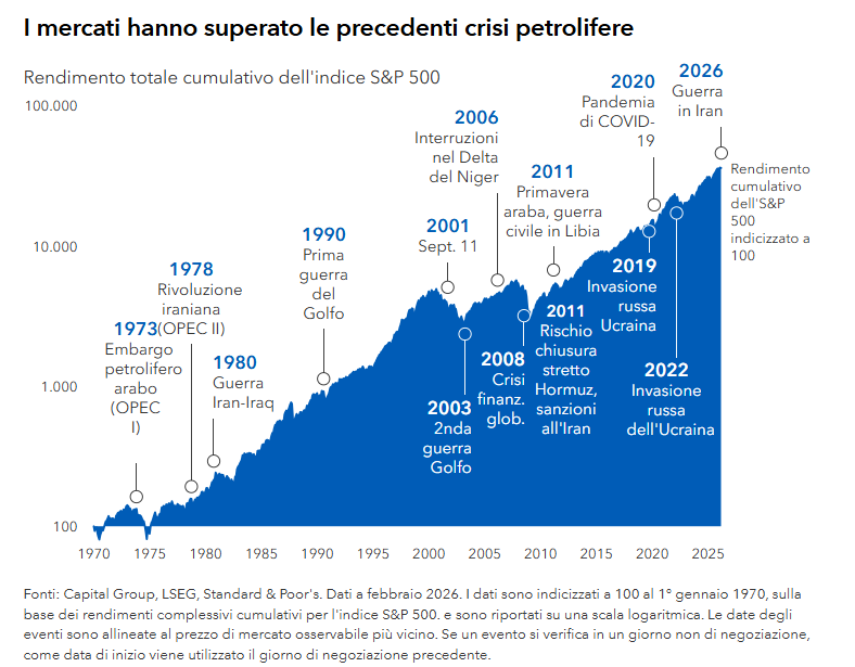 Fonti: Capital Group, Bloomberg, Standard & Poor's. Tra gli eventi geopolitici specifici che si riflettono nei dati sui rendimenti medi figurano: Prima guerra del Golfo (agosto 1990), Seconda guerra del Golfo (marzo 2003), interruzioni dell’approvvigionamento nel Delta del Niger (febbraio 2006), Primavera araba e guerra civile in Libia (febbraio 2011), rischio di chiusura dello Stretto di Hormuz e sanzioni contro l’Iran (dicembre 2011), attacco con droni alle stazioni petrolifere saudite (settembre 2019), invasione russa dell’Ucraina (febbraio 2022). Le date degli eventi sono allineate al prezzo di mercato osservabile più vicino ("T"). Se una crisi si verifica in un giorno non di negoziazione, come data di inizio viene utilizzato il giorno di negoziazione precedente. I rendimenti dell'orizzonte temporale sono misurati utilizzando il primo giorno di negoziazione disponibile a partire dall'orizzonte temporale indicato (ad es. "T+2 giorni"). I risultati passati non sono una previsione dei risultati futuri. I dati riflettono i rendimenti complessivi. Dati al 10 marzo 2026.